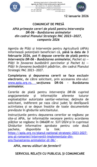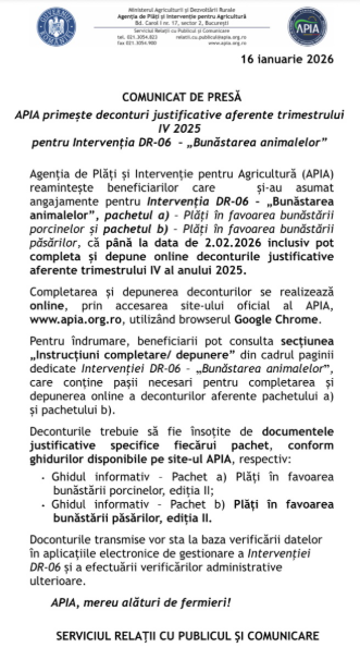 De asemenea, APIA reamintește beneficiarilor care și-au asumat angajamente pentru Intervenția DR-06 că pot depune deconturile justificative aferente trimestrului IV al anului 2025.