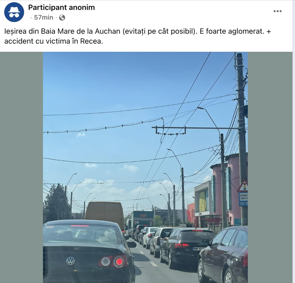 Un alt mesaj din trafic avertiza: „Ieșirea din Baia Mare de la Auchan – evitați pe cât posibil. E foarte aglomerat.”