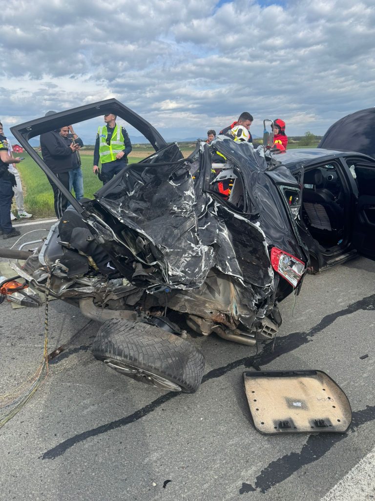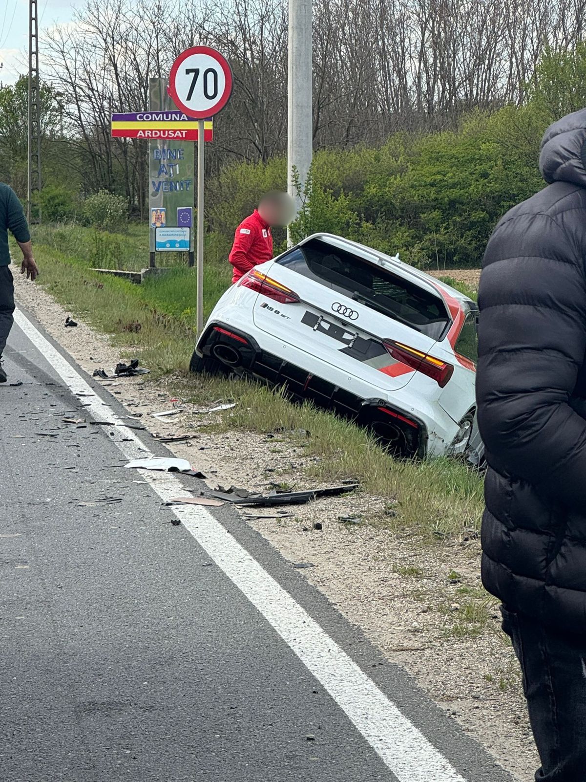 În aceste condiții, mașina a intrat în coliziune cu un autoturism care circula regulamentar din sens opus — un Audi RS6 GT, model exclusivist produs într-o serie limitată, înmatriculat în județul Bistrița Năsăud.