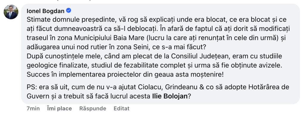 Ionel Bogdan a mai afirmat că, în afară de intenția de modificare a traseului în zona municipiului Baia Mare și adăugarea unui nod rutier în zona Seini, actuala administrație ar trebui să explice ce alte demersuri concrete a făcut.