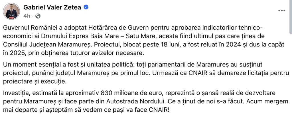 Gabriel Zetea a transmis că adoptarea Hotărârii de Guvern reprezintă ultimul pas care ținea de Consiliul Județean Maramureș, urmând ca proiectul să intre în etapa următoare, gestionată de CNAIR.