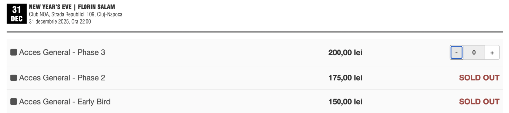 Interesul publicului a fost foarte mare: categoriile de bilete „Early Bird” și „Phase 2” au fost deja epuizate, iar în momentul de față mai sunt disponibile bilete la „Acces General – Phase 3”, la prețul de 200 de lei.