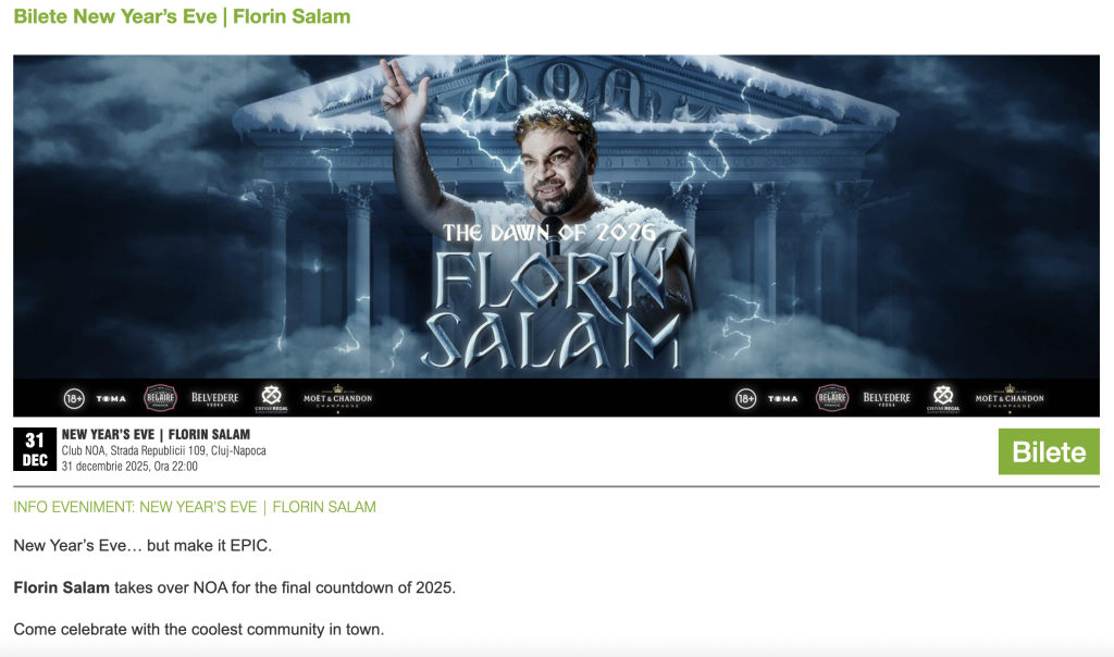 În noaptea de 31 decembrie 2025, Cluj-Napoca devine punct fierbinte pe harta petrecerilor de Revelion, cu două nume grele pe afiș: Florin Salam în Club NOA și Tzanca Uraganu alături de Vlăduța Lupău la Grand Hotel Italia, iar prețurile sunt între 200 și 800 de lei, în funcție de locație și pachet.