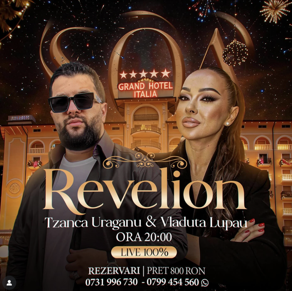 La câțiva kilometri distanță, la Grand Hotel Italia, clujenii au parte de un Revelion cu parfum de eveniment exclusivist. Pe afiș se regăsesc Tzanca Uraganu, Vlăduța Lupău și SOA, într-un format gândit pentru cei care vor să îmbine fine dining-ul cu muzica de petrecere.