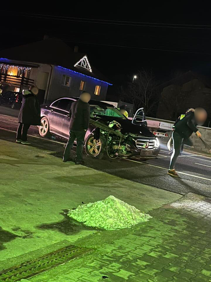 Autovehiculul implicat este un Mercedes-Benz de culoare neagră. În urma impactului, airbagurile s-au declanșat, iar partea frontală a mașinii a suferit avarii serioase, semn al forței coliziunii.