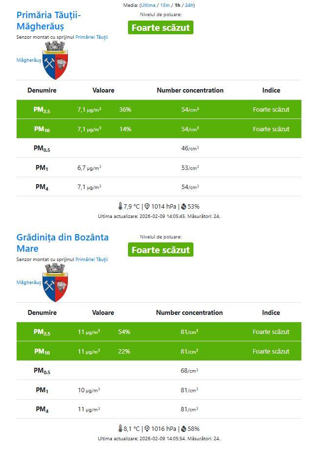Primăria Orașului Tăuții Măgherăuș anunță că a achiziționat și montat patru echipamente de monitorizare a calității aerului, care măsoară concentrația pulberilor în suspensie. Inițiativa urmărește informarea corectă a populației și creșterea nivelului de protecție a sănătății publice, prin acces la date actualizate în timp real.
