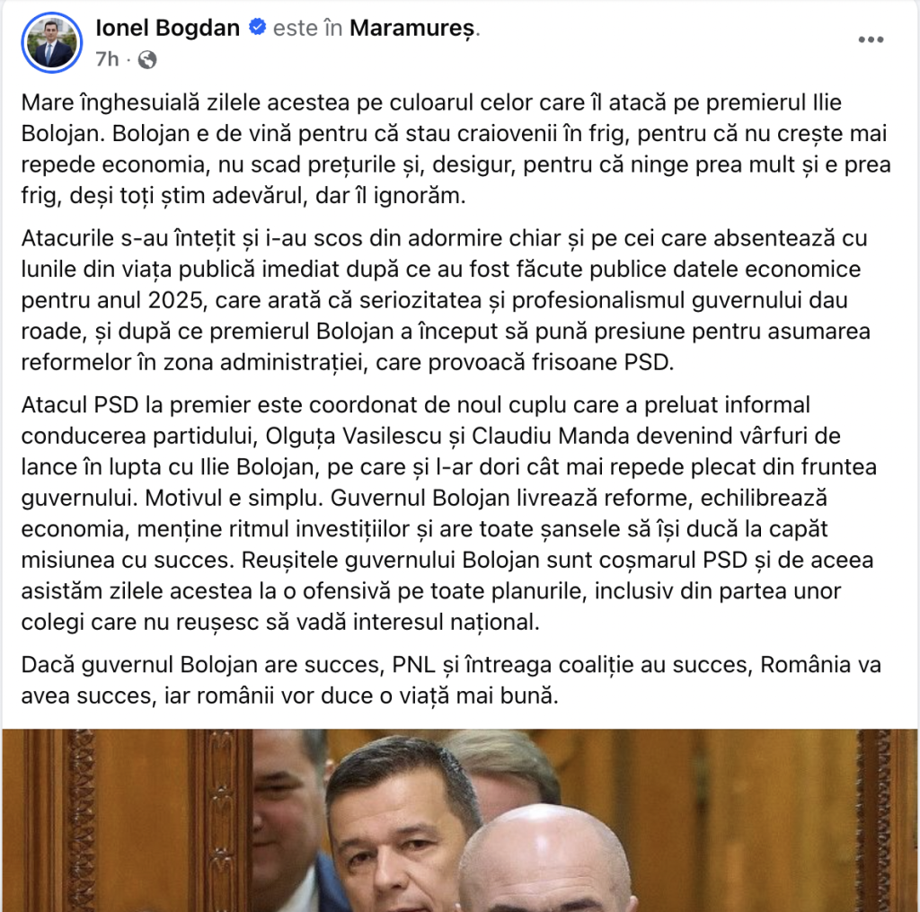 Astăzi, 28 ianuarie 2026, deputatul PNL de Maramureș, Ionel Bogdan, a atras atenția asupra unei intensificări a atacurilor politice la adresa premierului Ilie Bolojan, pe fondul publicării datelor economice pentru anul 2025 și al presiunilor pentru reforme în administrația publică.