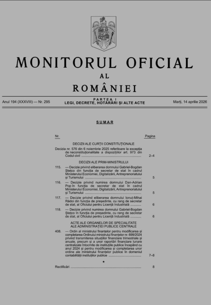 O serie de decizii publicate în Monitorul Oficial al României, Partea I, nr. 295 din 14 aprilie 2026, confirmă o schimbare rapidă în cariera lui Gabriel-Bogdan Ștețco, care a fost eliberat din funcția de secretar de stat și numit, în aceeași zi, președinte al Oficiului pentru Licență Industrială.