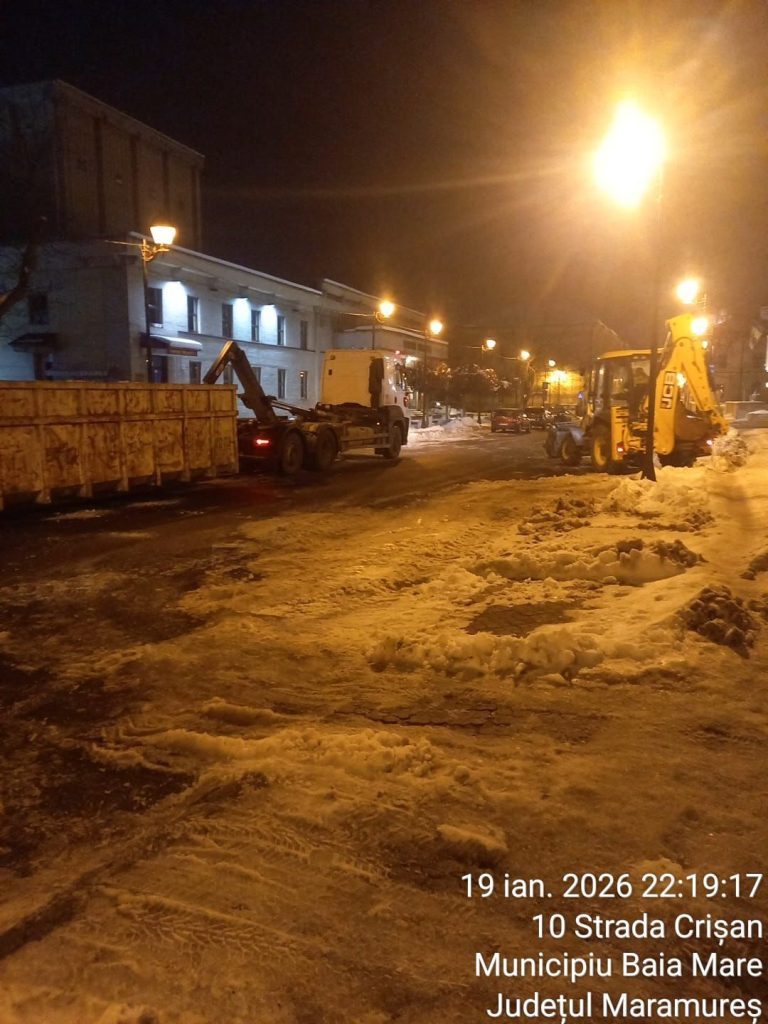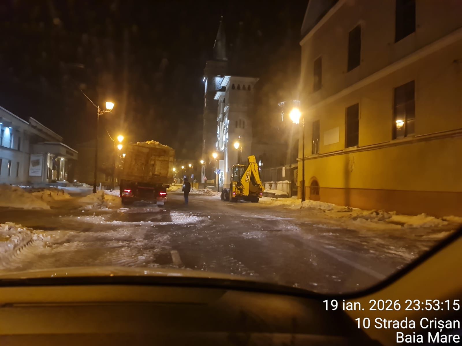 Municipalitatea băimăreană a continuat și ieri noapte, 19 spre 20 ianuarie 2026, intervențiile pentru degajarea zăpezii acumulate în zonele aglomerate ale orașului. În cursul serii trecute, echipele de deszăpezire au desfășurat o nouă acțiune de ridicare și transport al zăpezii, concentrată pe două puncte importante din municipiu.