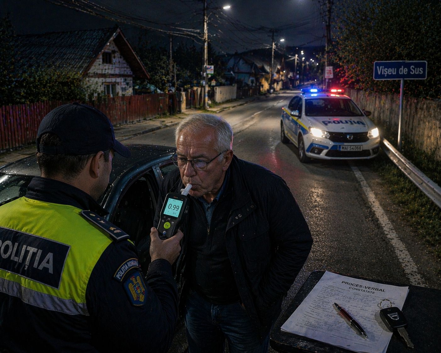 Un bărbat de 62 de ani a fost depistat de polițiștii din Vișeu de Sus în timp ce conducea sub influența alcoolului, pe strada Alexandru Ioan Cuza. Testarea cu aparatul etilotest a indicat o concentrație de 0,99 mg/l alcool pur în aerul expirat, iar șoferul a fost dus la spital pentru prelevarea probelor biologice.