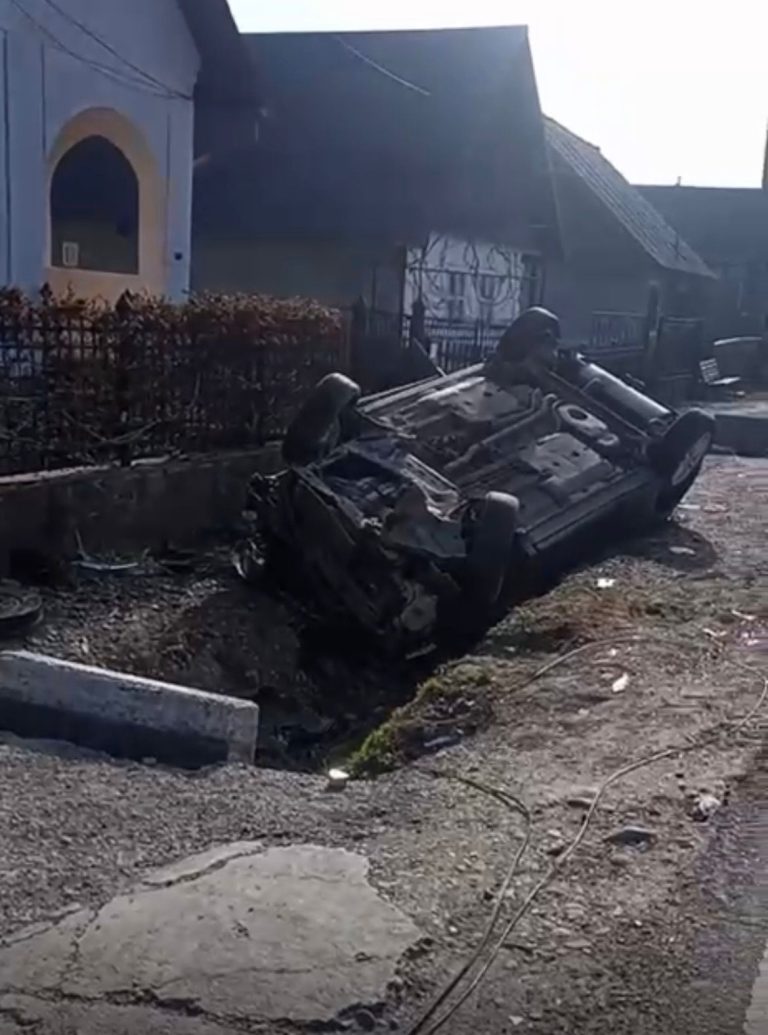 Autoturismul a acroșat mai întâi un stâlp din lemn aflat pe marginea drumului, apoi un cap de podeț, după care s-a răsturnat în afara părții carosabile, într-un șanț.